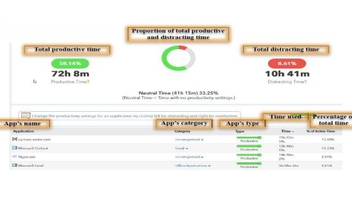 ✔ The active time spent in productive applications (Email, Office, CRM, ERP, CAD, Design, etc.)