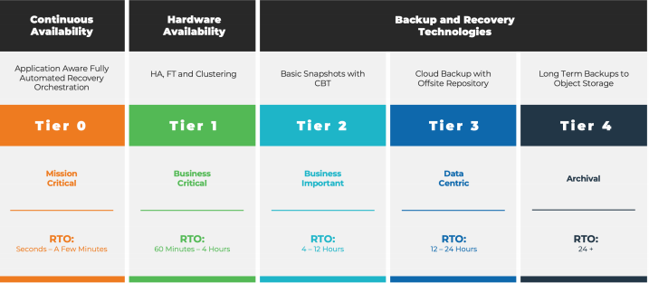 Neverfail Continuity Engine provides the highest level of protection available. From the diagram, most backup technologies are best suited for applications that require higher than 4-hour recovery times. Having too many Tier 2 – 4 applications in the midst of a major disaster, exposes the risk of a failed and/or corrupted recovery event.