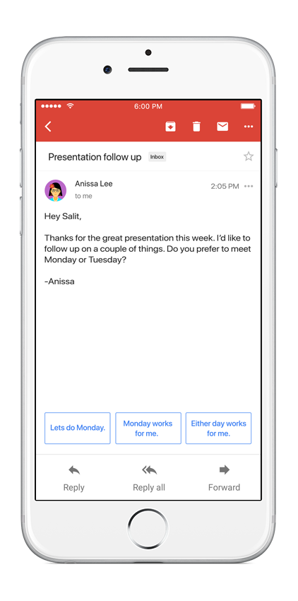 Allo, saves you time by suggesting quick responses to your messages. The feature already drives 12 percent of replies in Inbox on mobile. And starting today, Smart Reply is coming to Gmail for Android and iOS too.