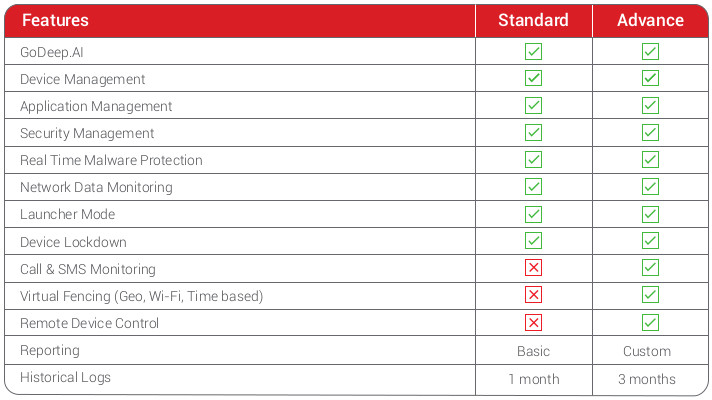- Network Data Monitoring: Monitor data usage over Mobile, Wi-Fi networks. Details of data consumer, calls, SMS, MMS sent and received on enterprise devices.