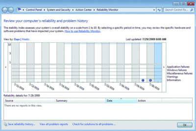 18. Check Reliability. The Reliability Monitor was introduced in Windows Vista as ‘The Reliability and Performance Monitor.” In Windows 7 it has been separated from Performance Monitor and moved to a new location under the Action Center. You open the Action Center in Control Panel and then look under the Maintenance options for the “View reliability history” link. You can also just type in Reliability Monitor from the Instant Search (see Figure 2).