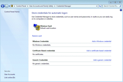 38. Manage Passwords. Control Panel includes a new application called Credential Manager. This may appear to be a completely new tool that allows you to save your credentials (usernames and passwords) for Web sites you log into and other resources you connect to (such as other systems). Those credentials are saved in the Windows Vault, which can be backed up and restored. However, you might see this as similar to a tool we have in XP and Vista. From the Instant Search, type in control /userpasswords2 and you will be brought to the Advanced User Accounts Control Panel, where you can also manage passwords for your account (see Figure 4).